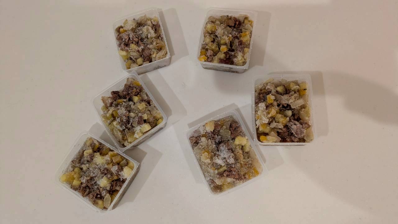 - 冷凍で保管し、与える分だけ解凍(600Wで約1分)。